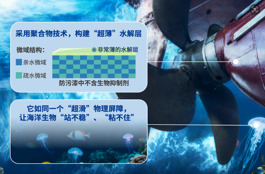 为保护海洋生态,立邦在AQUATERRAS的研发中,采用了不含生物抑制剂的环保配方和医学领域的抗血栓聚合物技术,通过构建亲水性与疏水性结合的超薄水解层,在船体表面形成“超滑”物理屏障,让海洋生物在漆膜表面“站不稳”、“粘不住”,在不影响海洋环境的前提下,高效防止生物附着。得益于AQUATERRAS出色的防污效果,船体表面更加光滑,船舶的航行阻力大幅减少,航行能耗和碳排放也显著降低。