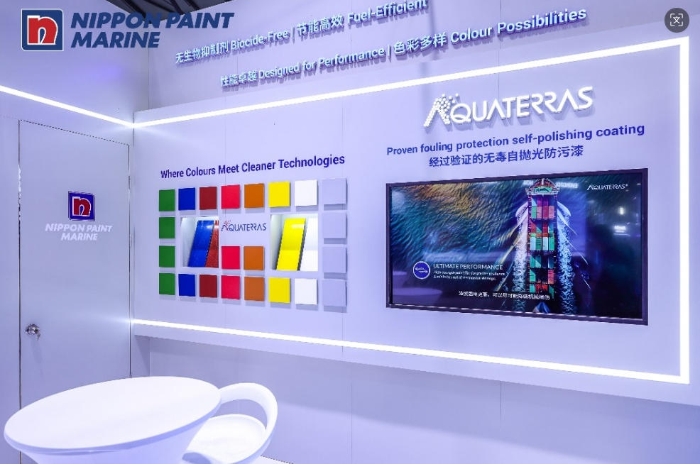 自2004年,立邦船舶涂料进入中国市场以来,业务得到高速发展,已建立起研发、制造、销售与服务的完整体系,凭借先进的本地化生产能力与高效的供应链网络,快速响应客户需求,能为船东及航运企业提供包含底漆、面漆、稀释漆和防污漆等各类型的船舶涂料解决方案,为船舶的全生命周期提供端到端的专业涂装解决方案与技术服务。 在全球航运业绿色转型驱动下,立邦持续推动可持续产品的迭代创新。本届海事展上,立邦集中展示了多款融合环保理念与卓越性能的涂装解决方案。其中,全新发布的AQUATERRAS 1100作为立邦首款不含生物抑制剂的防污涂料AQUATERRAS的升级系列,在原有环保配方基础上进一步提升了漆膜的平滑度与耐久性,既能提供长效防污保护,减少海洋生物附着,更能显著降低航行阻力,助力船舶节省多达14.7%的燃油消耗。此外,立邦还同步展出了具备优异节油减排性能的FASTAR防污涂料,以及能有效反射太阳辐射、降低船体温度的Ever Cool等一系列创新解决方案,致力于为改善海洋生态提供更多“创新解法”。