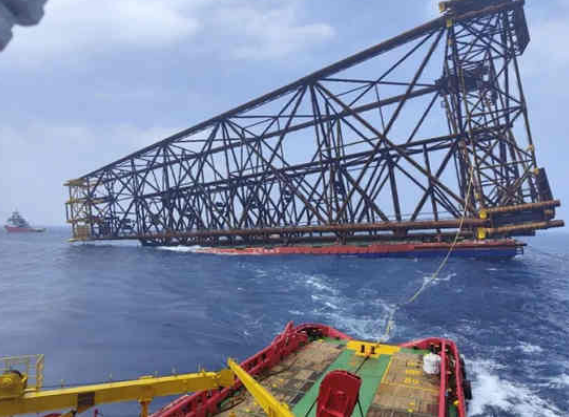 4月16日,中国船舶武汉船机海西重机码头,总重约6000吨马国油MOPU平台缓缓脱离浮箱小车,四条桩腿站立码头附近海域,标志着该平台完成下水里程碑节点。 |